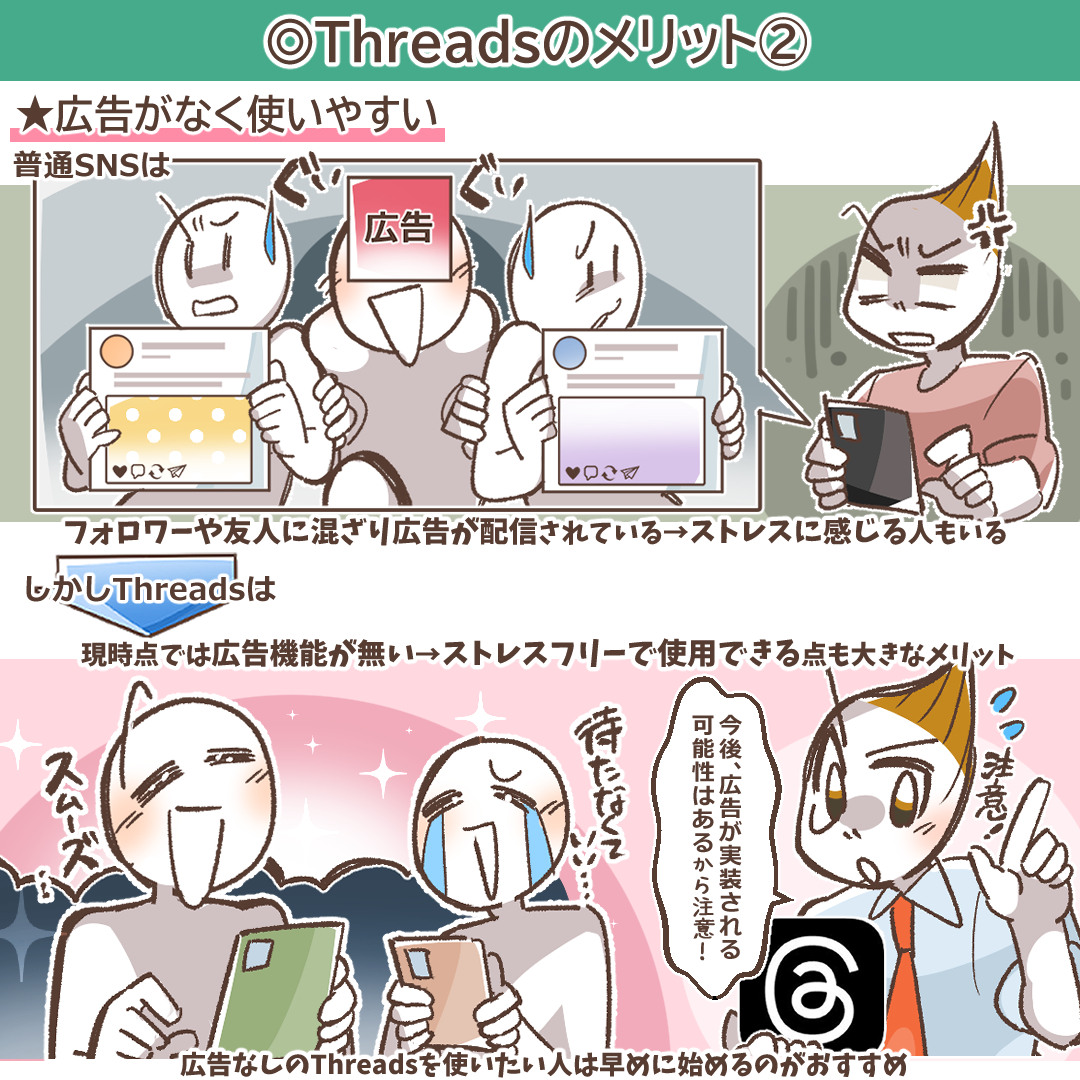 Threads(スレッズ)は現時点では広告機能が無いため、ストレスフリーで使用できる点も大きなメリットです。