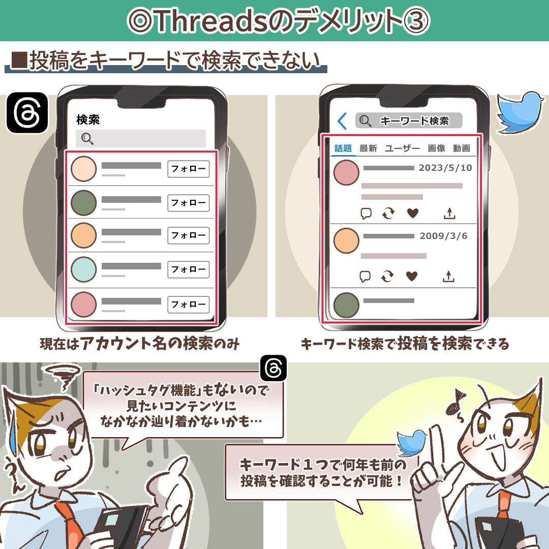 Twitter(ツイッター)では投稿を検索でき、キーワードひとつで何年も前の投稿を確認することが可能ですが、Threads(スレッズ)にはそのような機能が使えない状態です。
