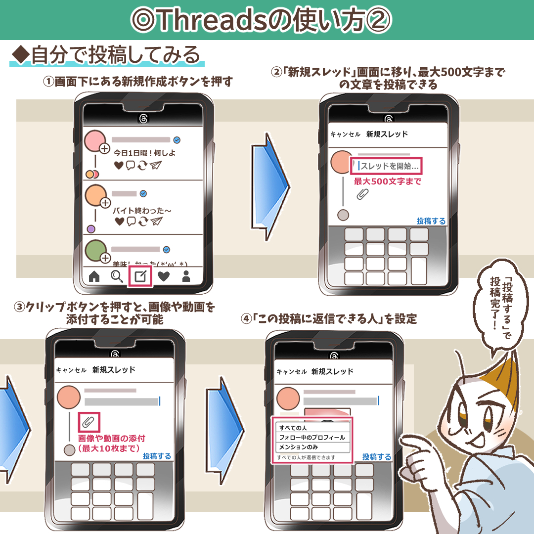 Threads(スレッズ)のメインとしての投稿方法は、文章によるもので、1回につき500文字までのテキストを投稿できます。