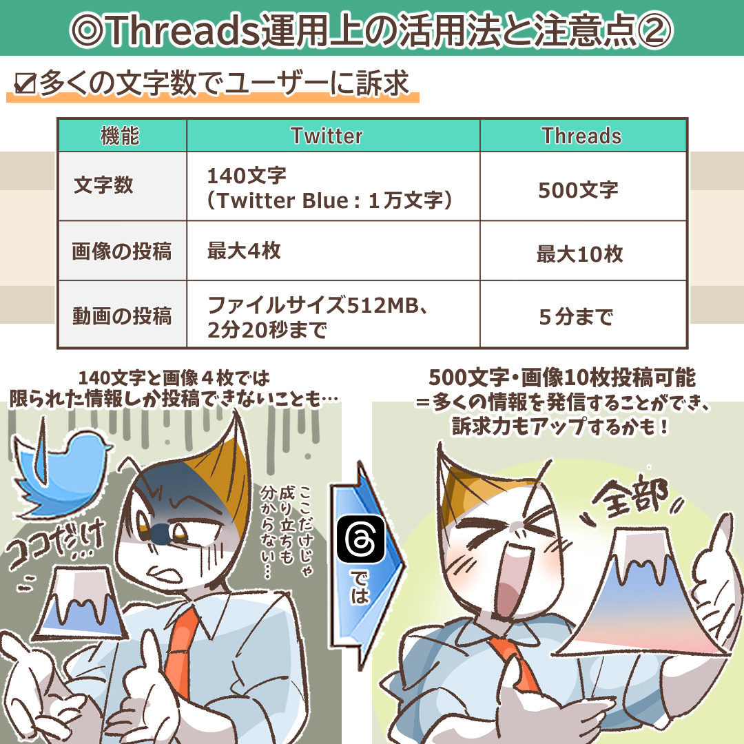 Threads(スレッズ)であれば1度に500文字・画像10枚投稿可能です。多くの情報を発信することができるので、ユーザーに対する訴求力アップが期待できます。